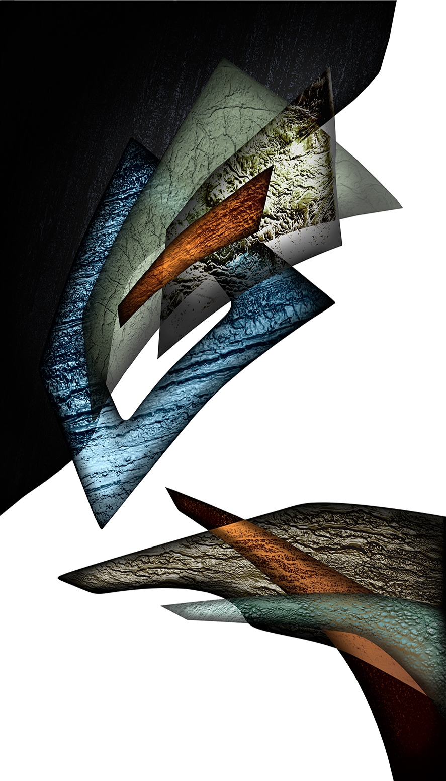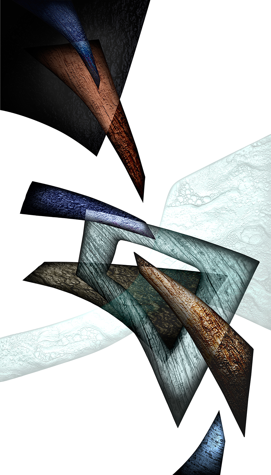While the matrices of my prints are digital files, the elements that make up their compositions are not generated digitally – they are made by me 3-D objects covered with variety of textures then digitalized. I explore their expressive possibilities arranging them within multiple layers of graphic software, modifying them and enriching with color and transparency while searching for my personal metaphors and symbols.