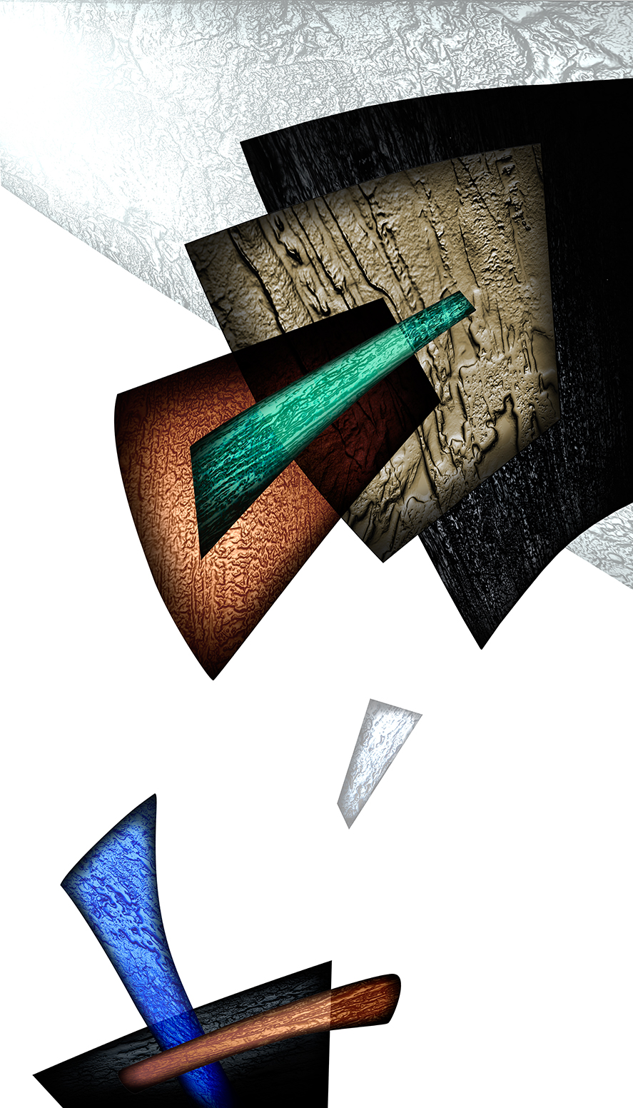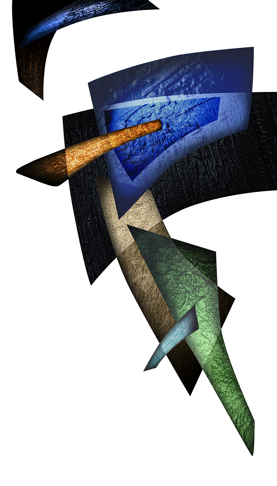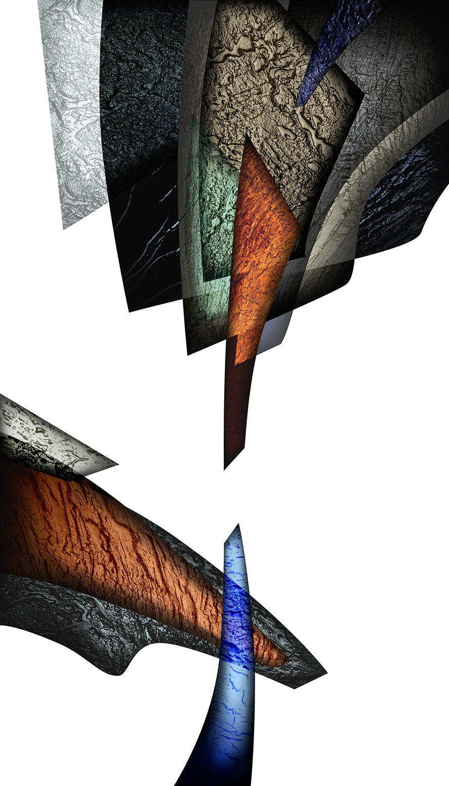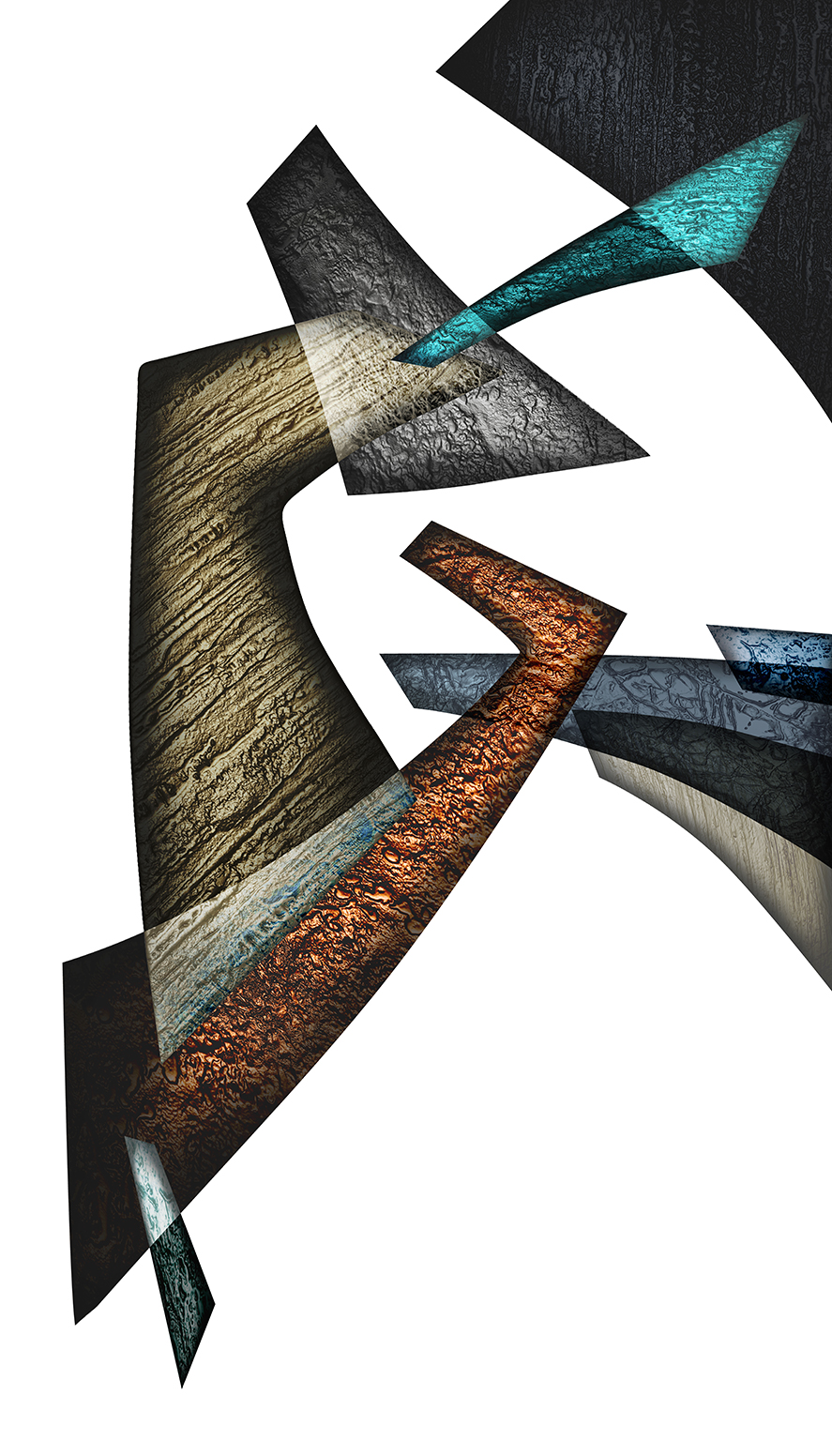 While the matrices of my prints are digital files, the elements that make up their compositions are not generated digitally – they are made by me 3-D objects covered with variety of textures then digitalized. I explore their expressive possibilities arranging them within multiple layers of graphic software, modifying them and enriching with color and transparency while searching for my personal metaphors and symbols.