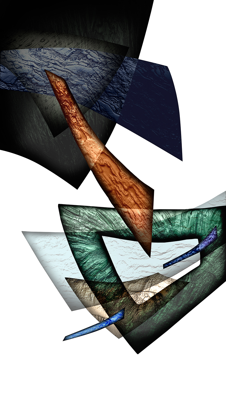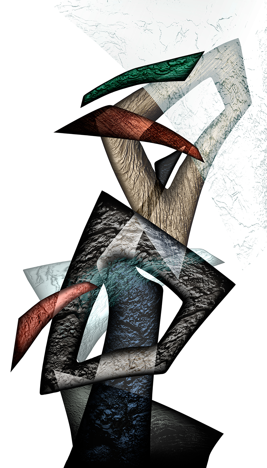 While the matrices of my prints are digital files, the elements that make up their compositions are not generated digitally – they are made by me 3-D objects covered with variety of textures then digitalized. I explore their expressive possibilities arranging them within multiple layers of graphic software, modifying them and enriching with color and transparency while searching for my personal metaphors and symbols.