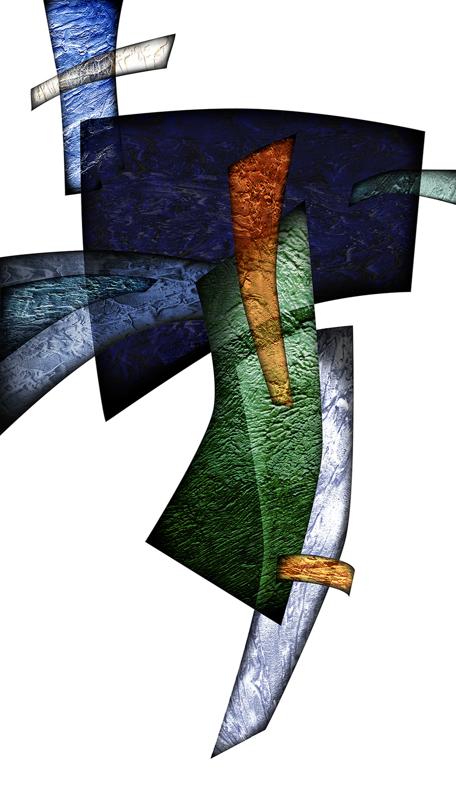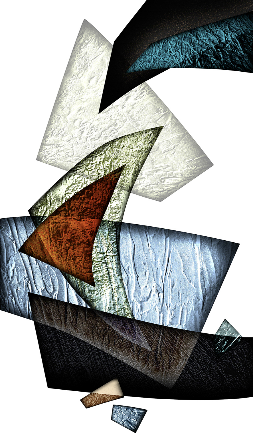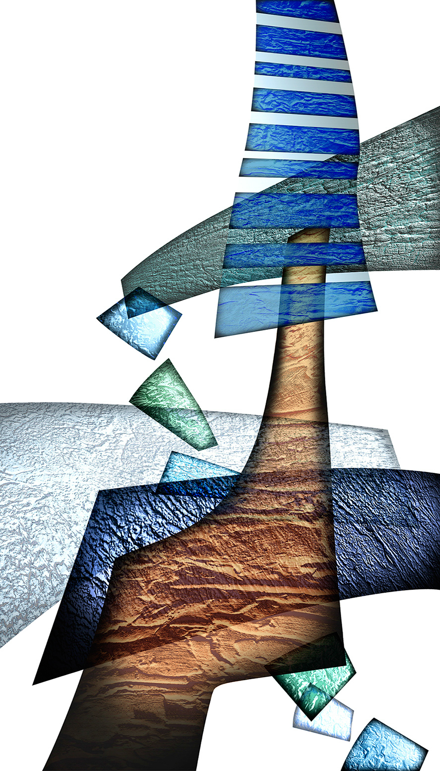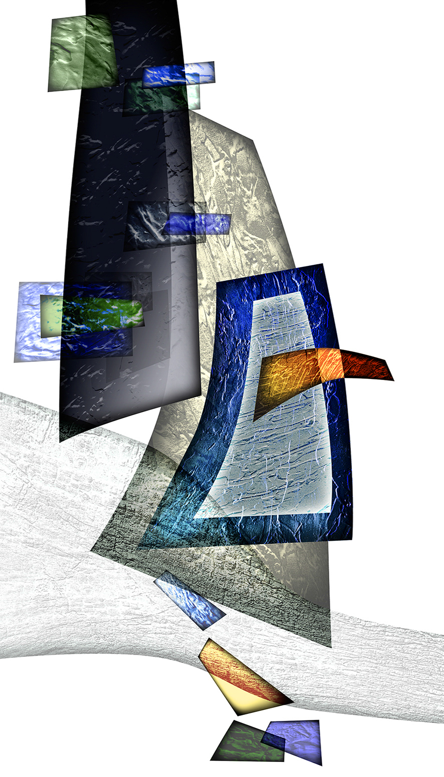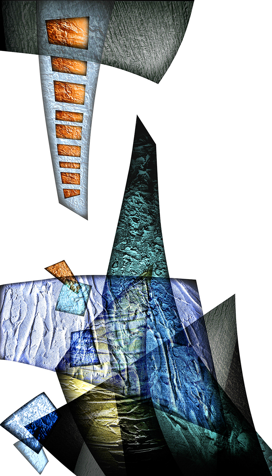 While the matrices of my prints are digital files, the elements that make up their compositions are not generated digitally – they are made by me 3-D objects covered with variety of textures then digitalized. I explore their expressive possibilities arranging them within multiple layers of graphic software, modifying them and enriching with color and transparency while searching for my personal metaphors and symbols.